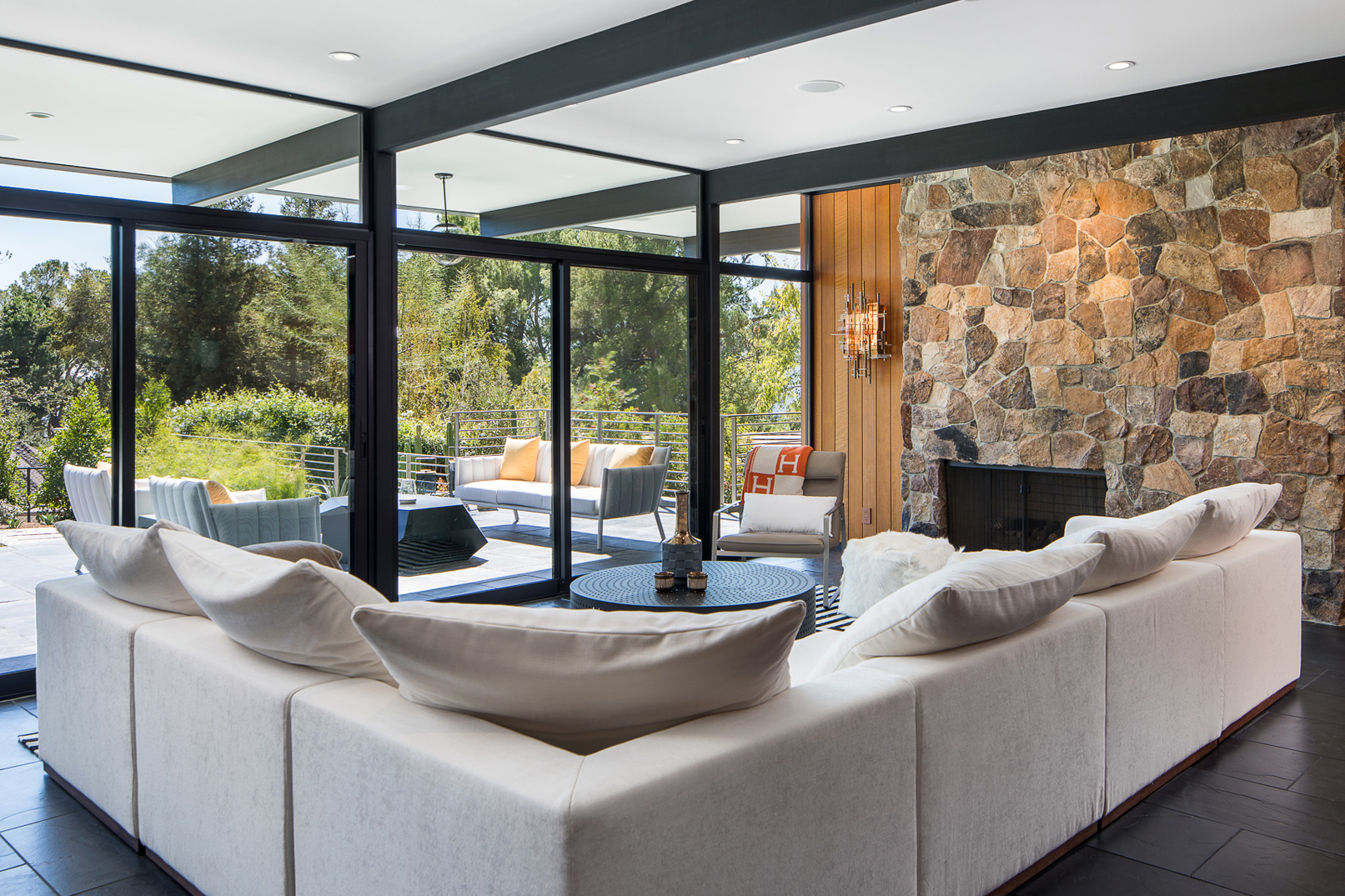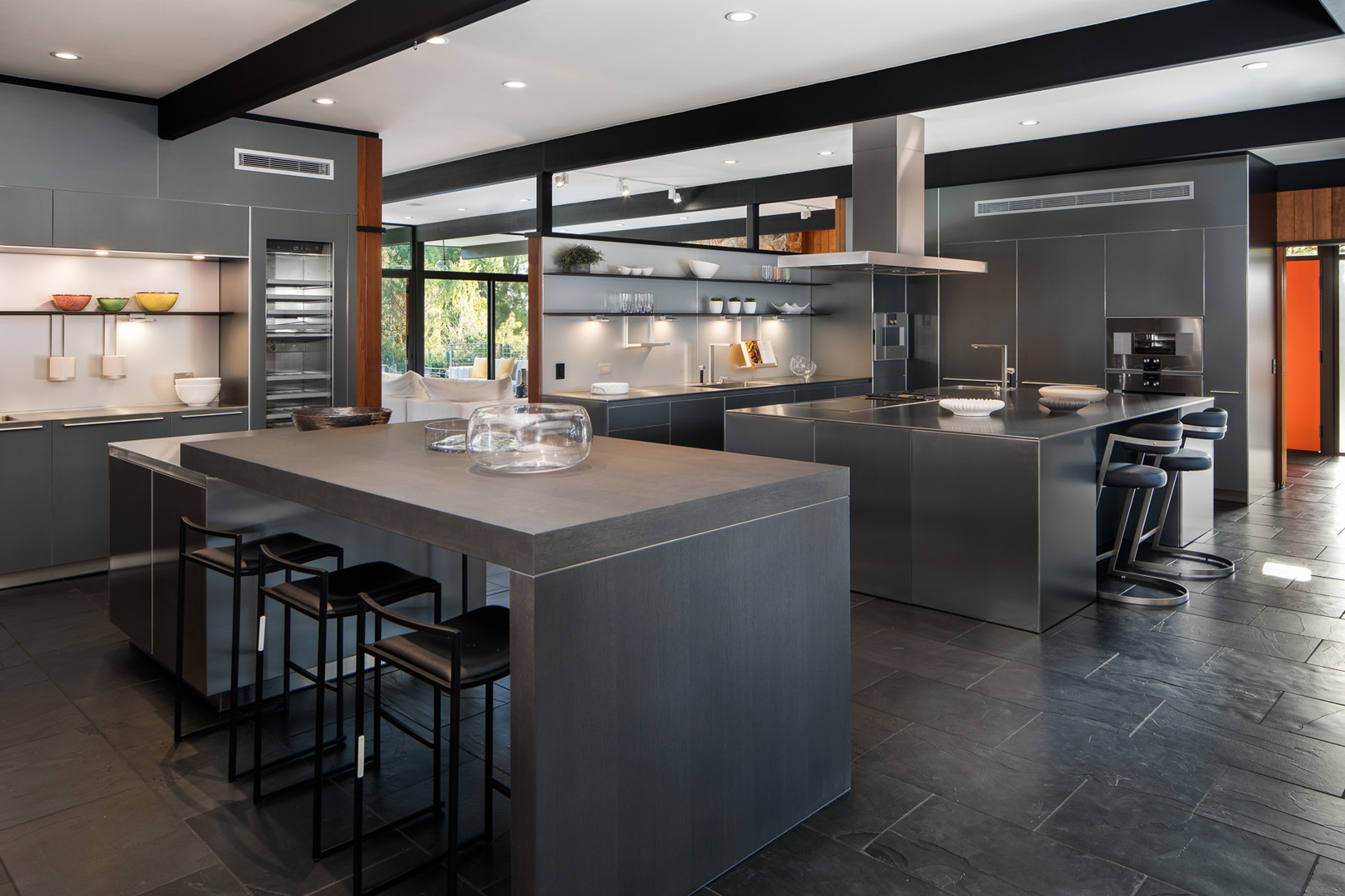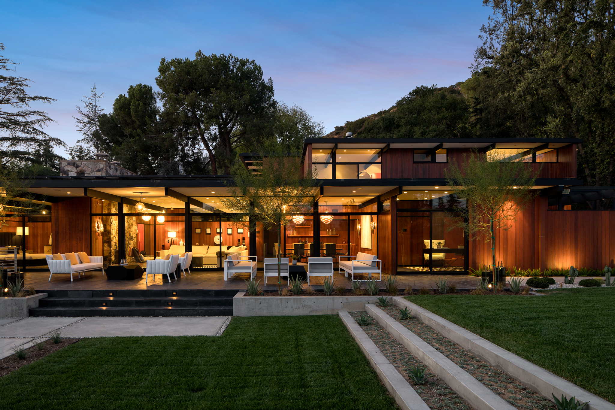 Stunning custom built mid-century modern home nestled in the foothills of La Canada. Reimagined in 2008 by designer Jamie Bush and Osborn Architects, this home was awarded a prestigious Architectural Merit Award by Pasadena Foothill AIA in 2012. Set on a cul-de-sac on a 1/2 acre of land, this home features 5 bedrooms, two of which are en suite master bedrooms - five bathrooms, a sauna, steam room and pool with Jacuzzi. Floor-to-ceiling windows dominate the main rooms along with black slate floors. The stainless Bulthaup kitchen boasts two Sub Zero refrigerators, a high-end dishwasher, oven, stove and warming drawer. Additionally, the home features Creston lighting and AV system, central vacuum system, 4-zone central air and heat, central sound system, projector and screen in the family room, a workout/utility room, three gas fireplaces, and a temperature-controlled wine cellar.