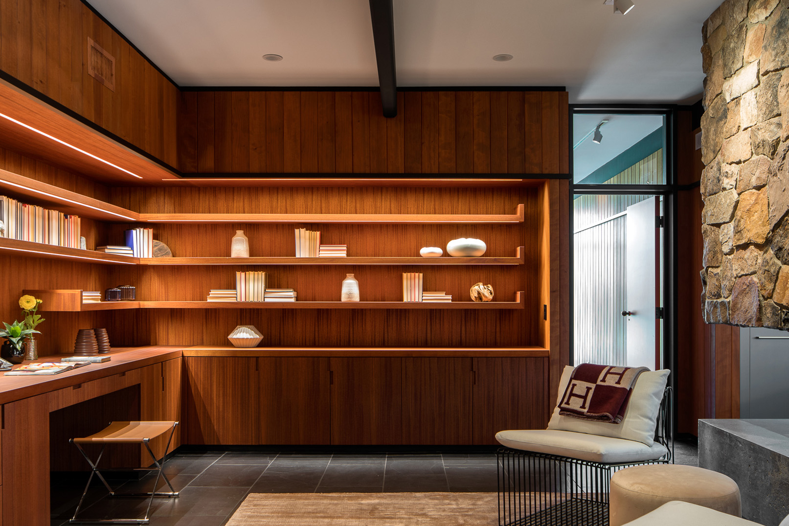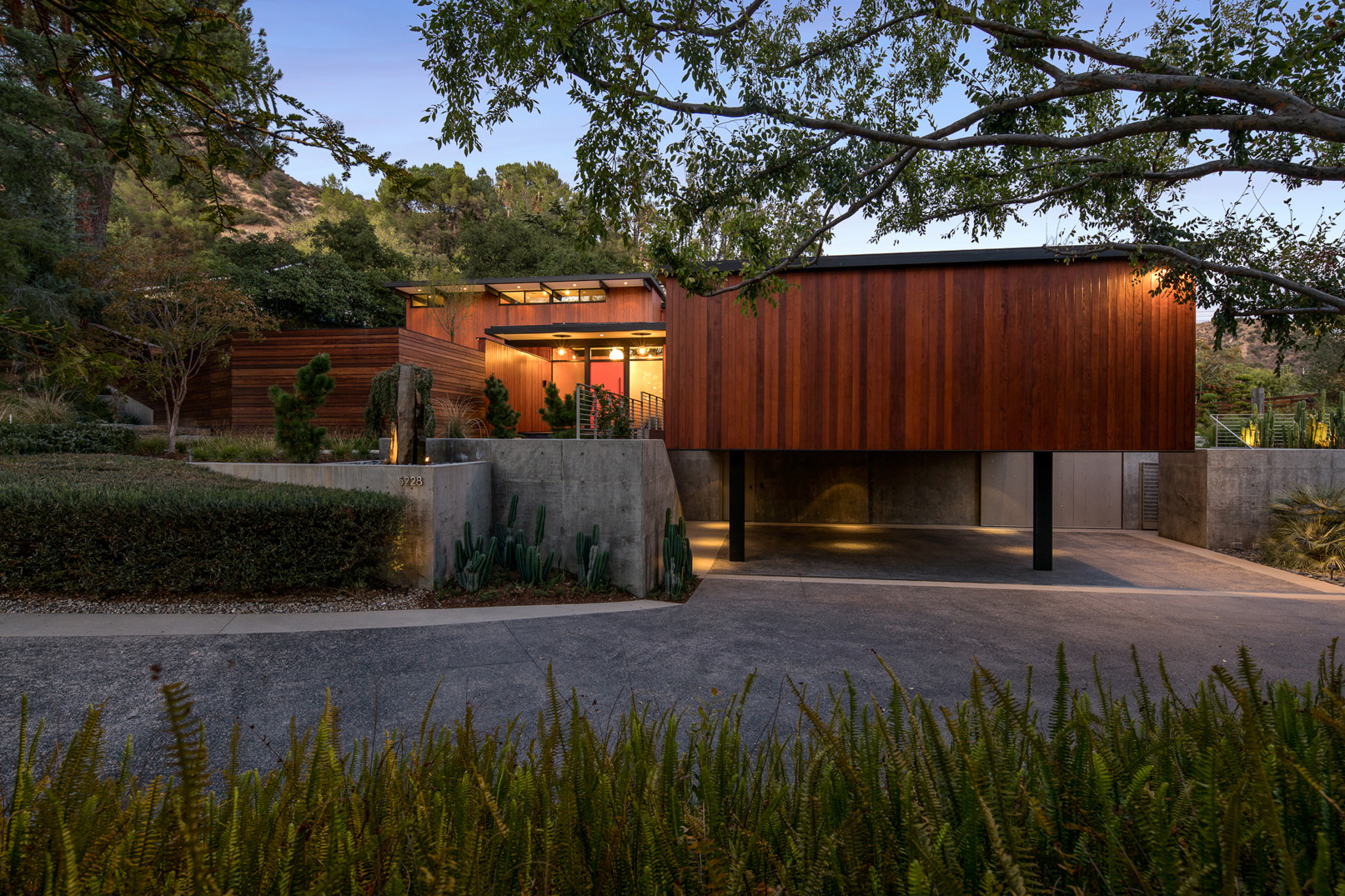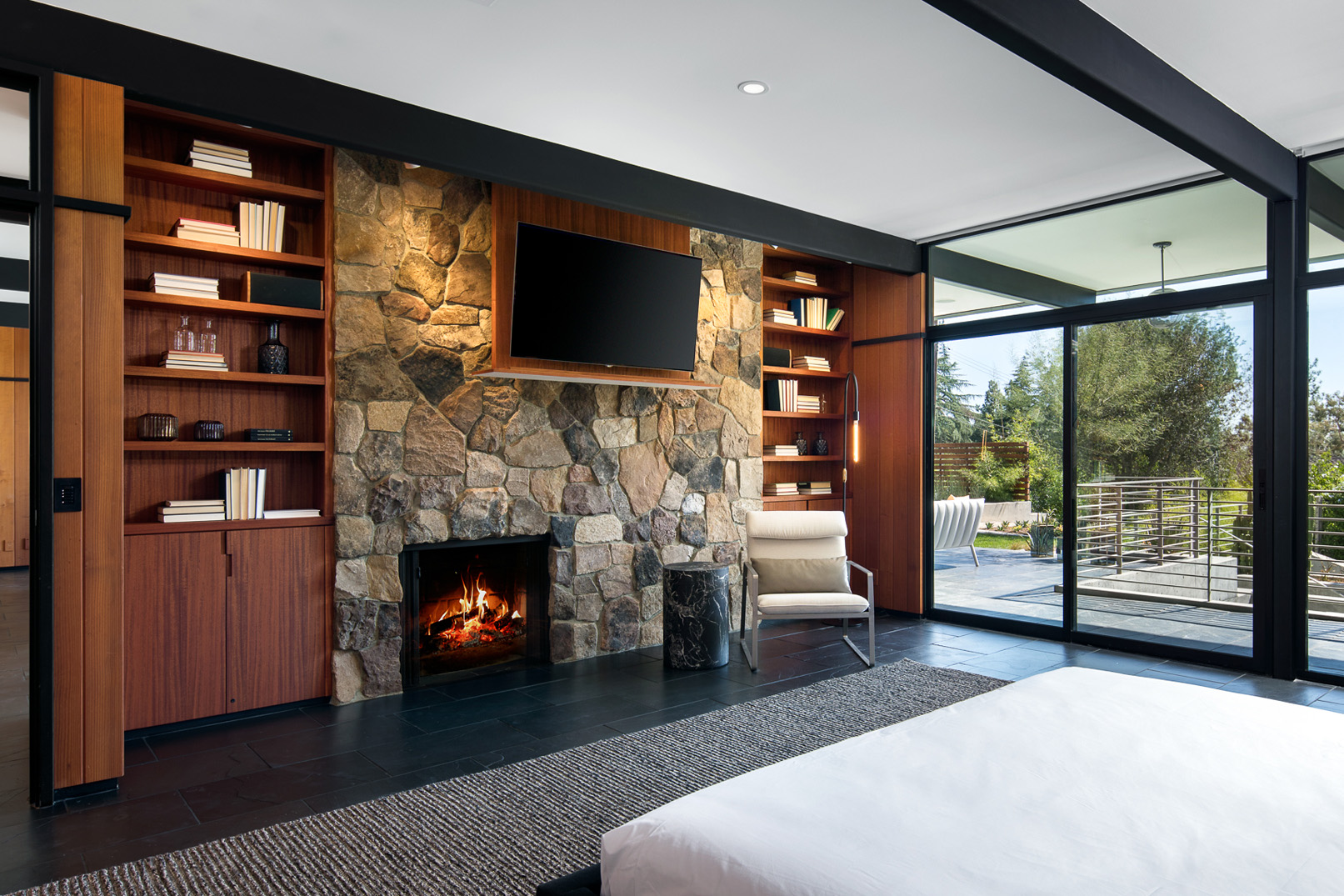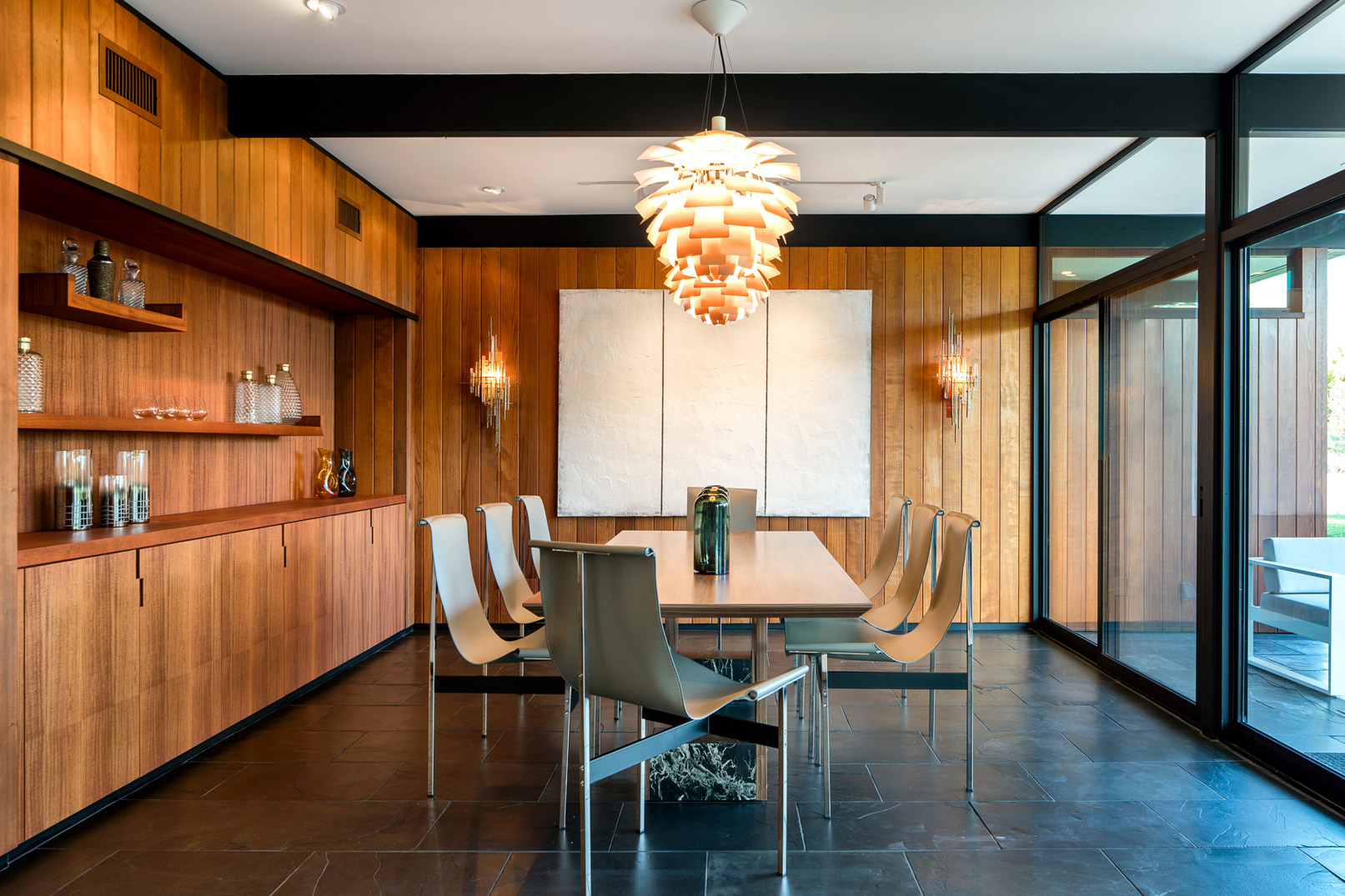 Stunning custom built mid-century modern home nestled in the foothills of La Canada. Reimagined in 2008 by designer Jamie Bush and Osborn Architects, this home was awarded a prestigious Architectural Merit Award by Pasadena Foothill AIA in 2012. Set on a cul-de-sac on a 1/2 acre of land, this home features 5 bedrooms, two of which are en suite master bedrooms - five bathrooms, a sauna, steam room and pool with Jacuzzi. Floor-to-ceiling windows dominate the main rooms along with black slate floors. The stainless Bulthaup kitchen boasts two Sub Zero refrigerators, a high-end dishwasher, oven, stove and warming drawer. Additionally, the home features Creston lighting and AV system, central vacuum system, 4-zone central air and heat, central sound system, projector and screen in the family room, a workout/utility room, three gas fireplaces, and a temperature-controlled wine cellar.